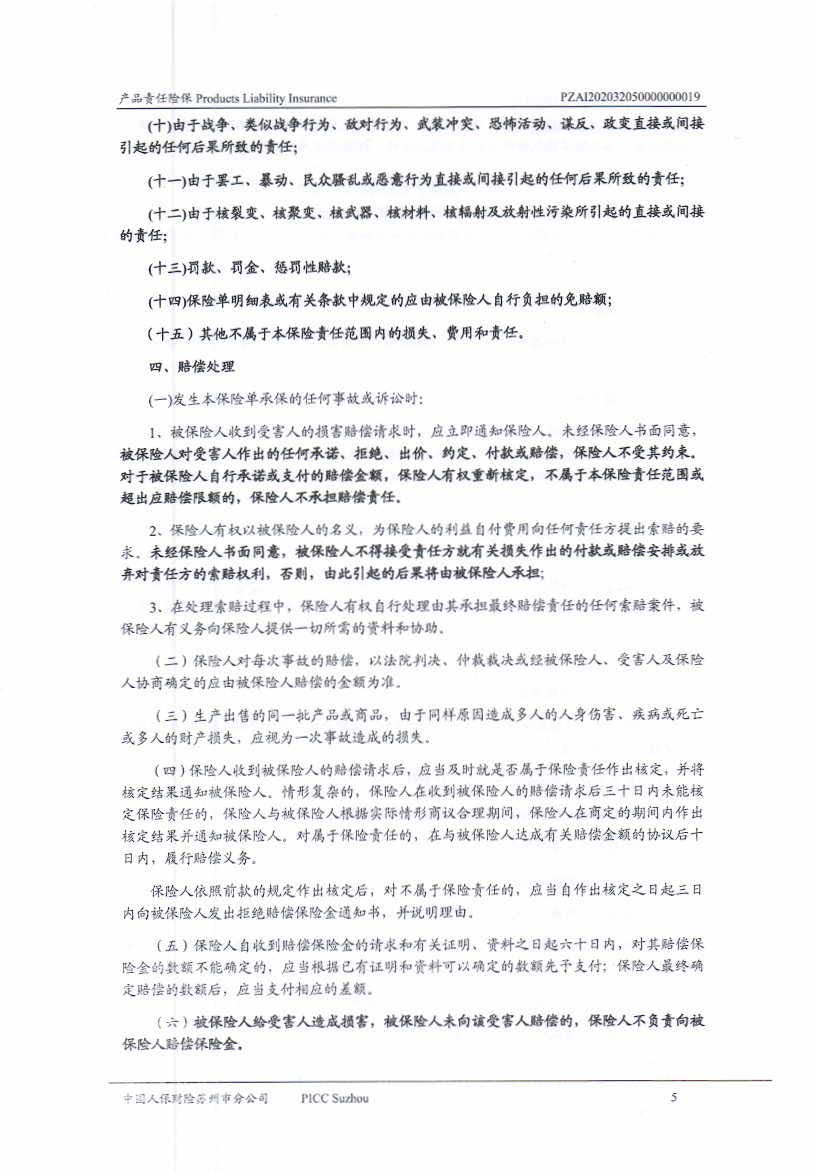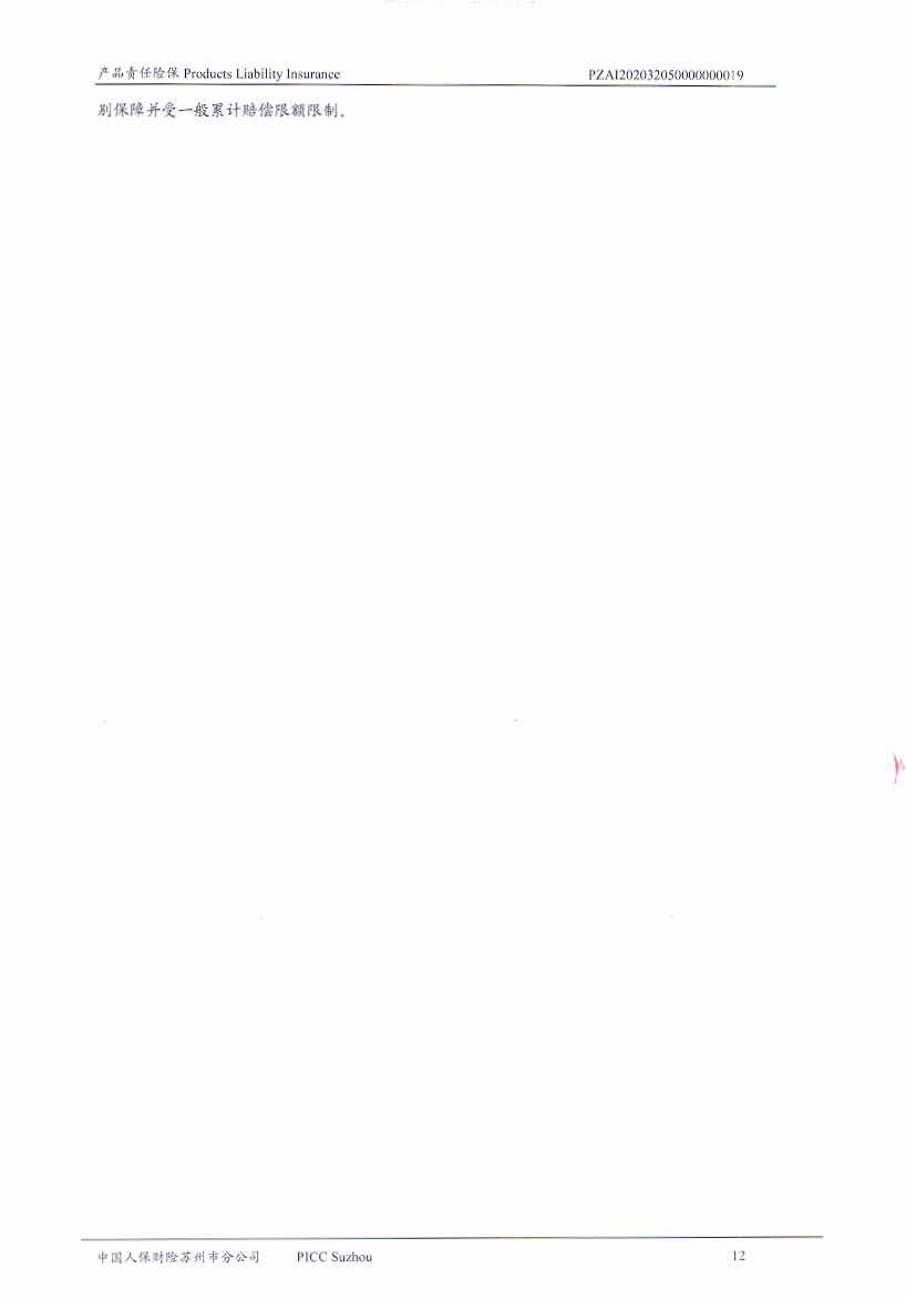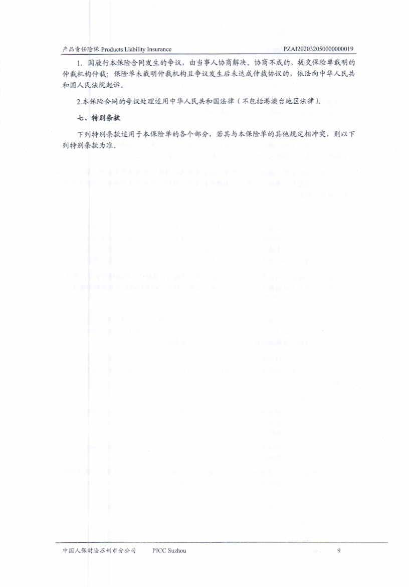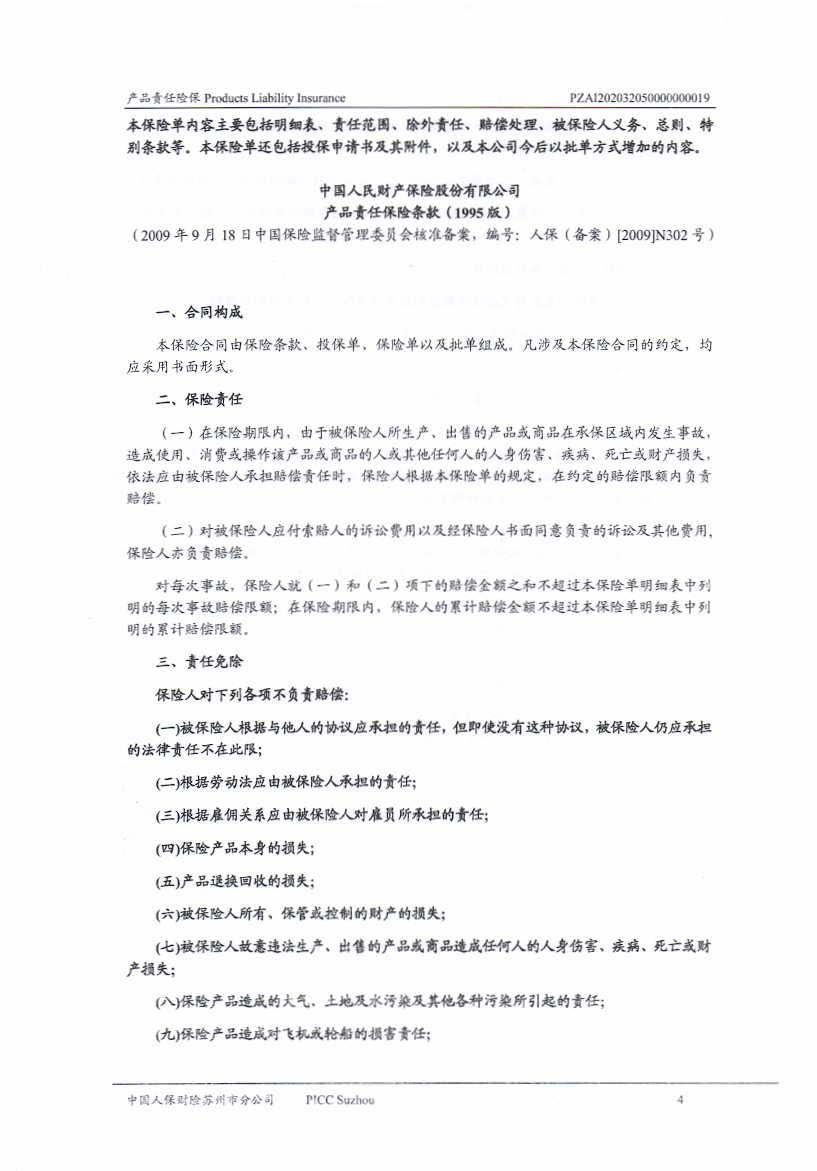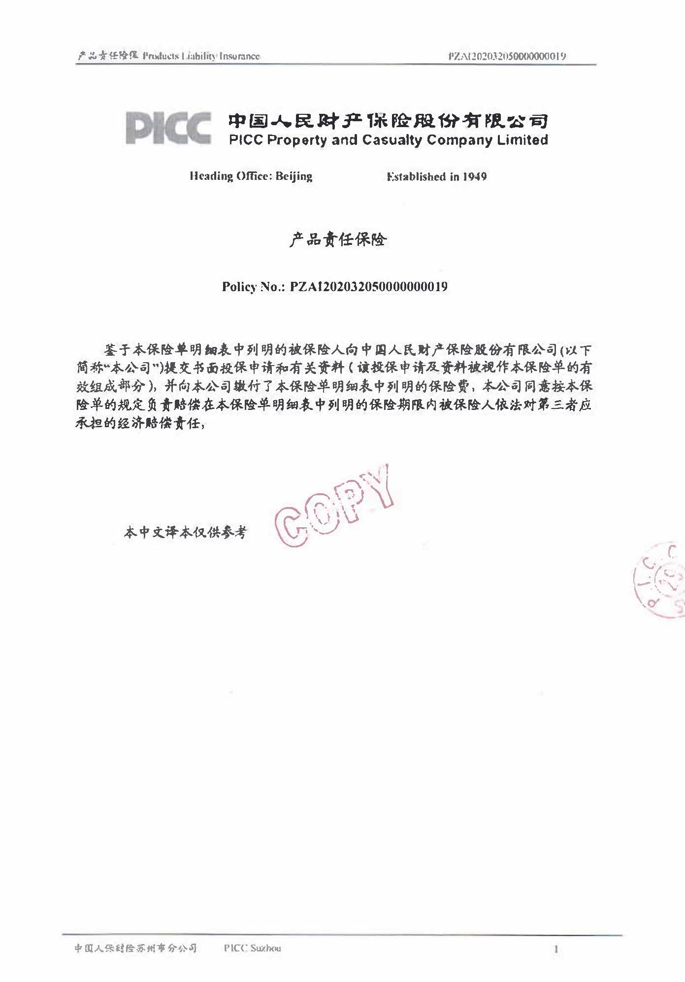 產品責任保險 Policy No.PZAI202032050000000019(中文版)